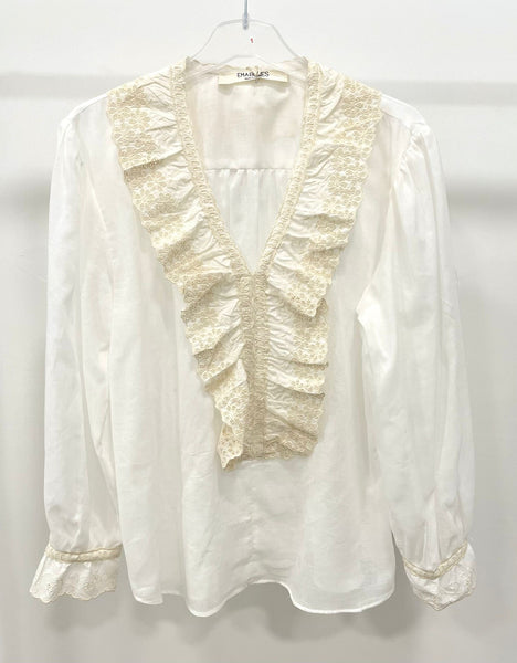 The perfect 'wear with jeans' blouse. We love the triple layer lace detail. Made in France.Size 1: 8-10Size 2: 10-12Size 3: 12-14Fibre Composition: 100% Cottonhand wash 30 Degree Cycle