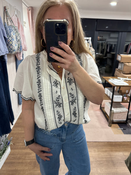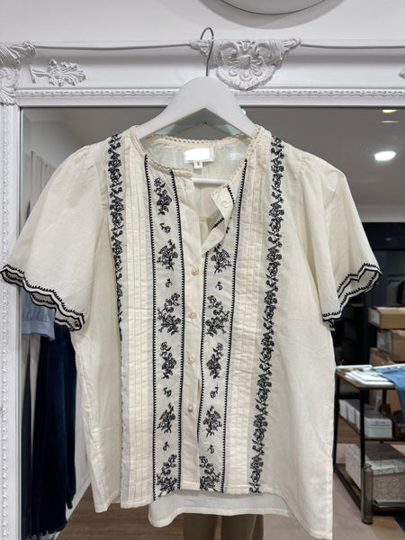 The cool cream base offsets the detailed black embroidery perfectly. I love the elevated scallop sleeve.Size S: 8-10Size M: 12Size L: 14Fibre Composition: 100% CottonHand Wash 30 Degree Cycle