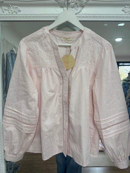 Soft pale pink with gorgeous inlaid lace, I love the embroidery on the front chest. The perfect top to wear with jeans.Size S/M: 8-12Size M/L: 12-16Fibre Composition: 100% CottonHand Wash 30 Degreed