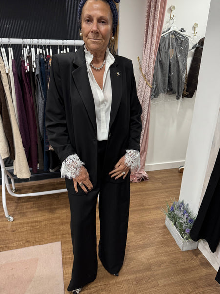 This Scarlet Roos suit ticks so many of this seasons trends with the perfect silhouette.  Slim but over sized, we love the satin collar revere and the diamanté brooch which adds a little touch of elan.  Style with a camisole or the new Ema Blues Olivia white lace blouse and you are evening ready!  Made in France